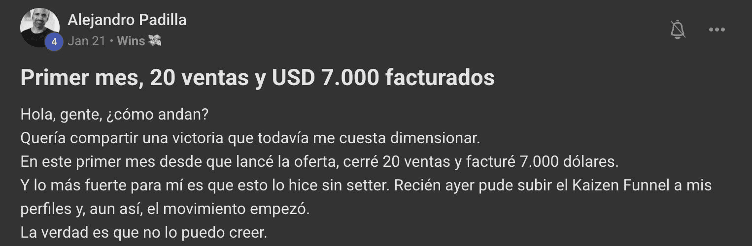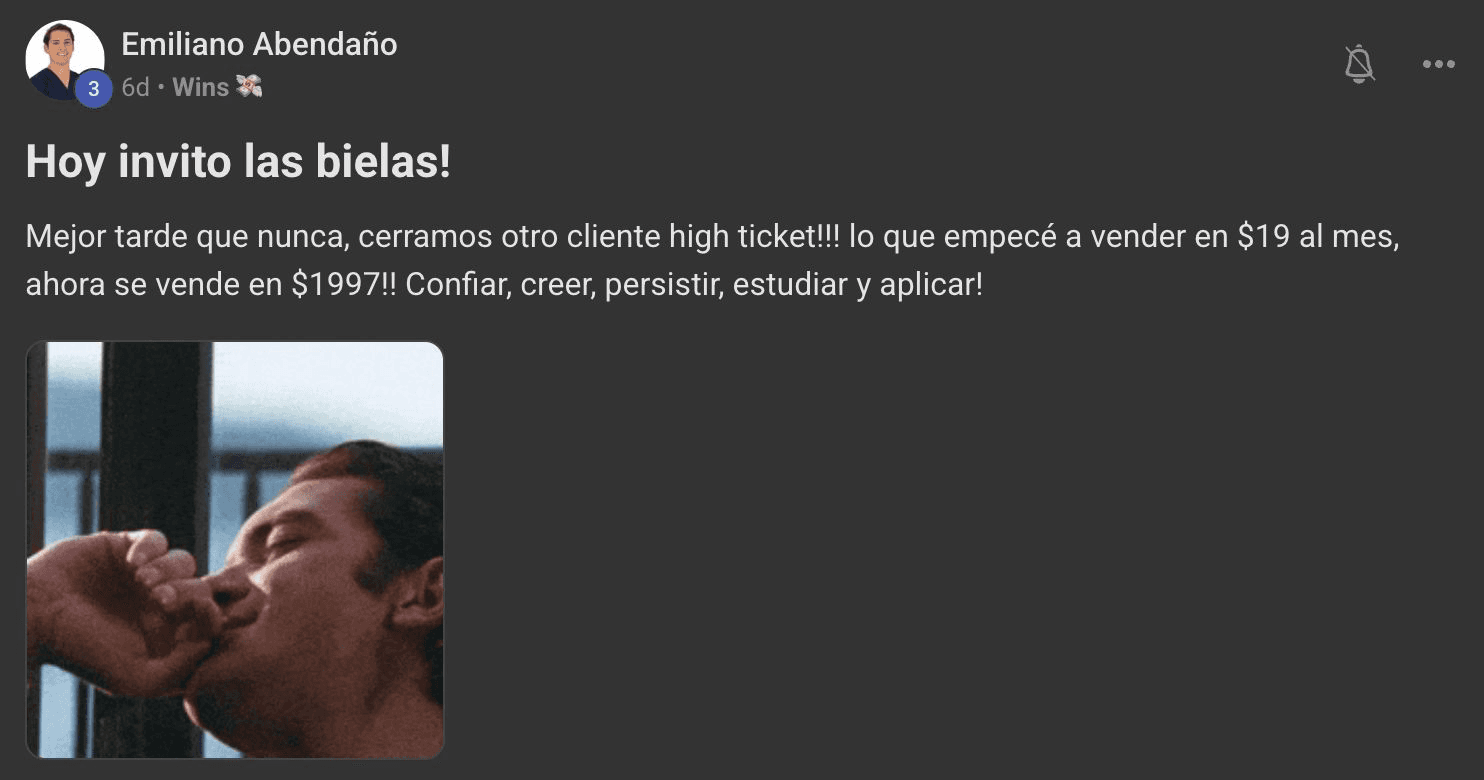 Transcisionamos su agencia a un modelo de consultoría y en 1 semana del programa ya había recuperado la inversión. A día de hoy gracias a optimizar su oferta y a que lo ayudamos a armar su equipo de ventas y todo su ecosistema en TikTok, Instagram, Anuncios y YouTube tiene un negocio con 75% de margen.