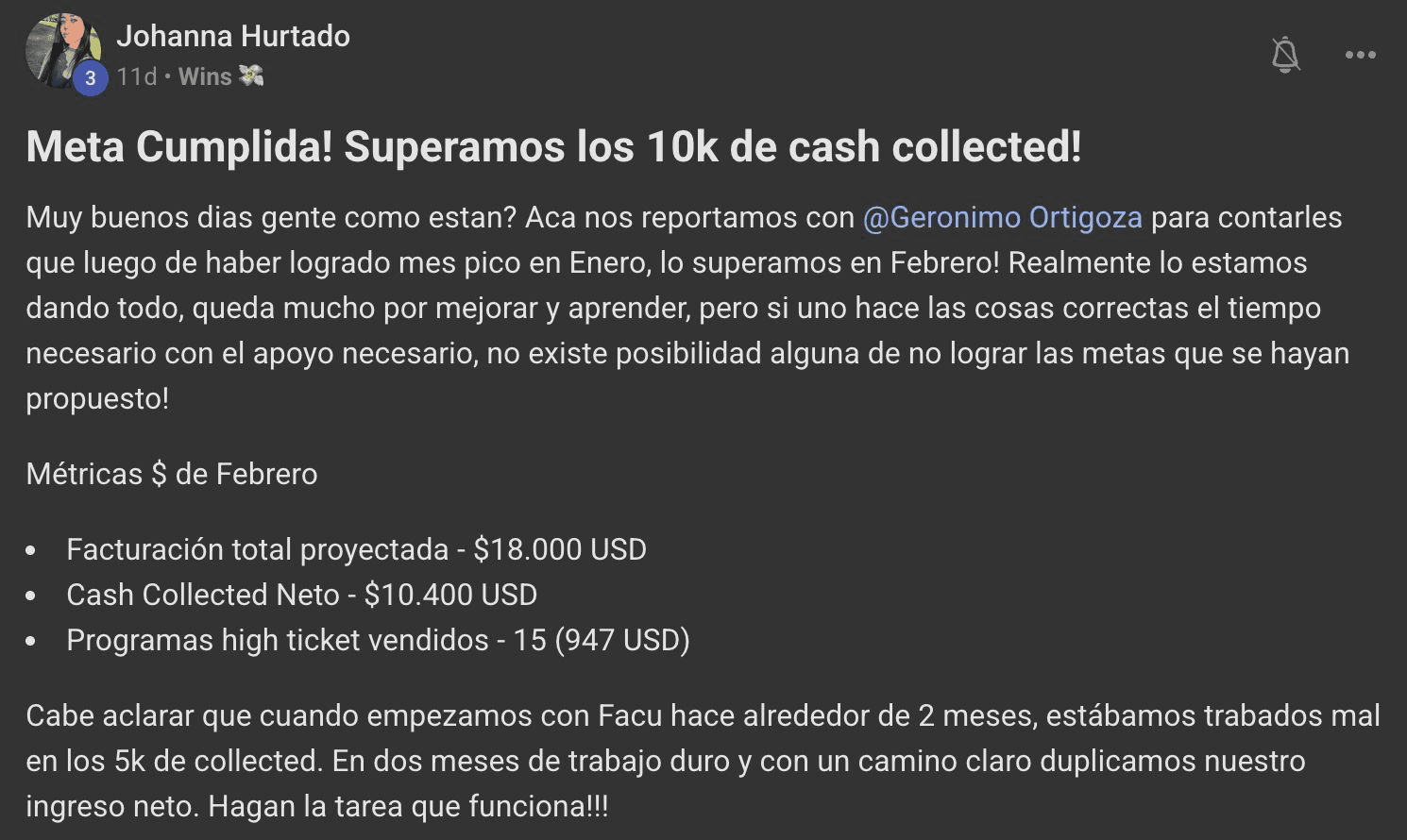 Duplicaron su facturación el primer mes del programa y luego siguieron escalando a un mínimo de 30k/mes, sin pagar publicidad.
